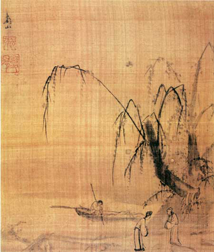 (约1403 -1490),字阳,以字行,号南山,浙江平湖人,道士,山水仿吴镇,墨气苍劲淋漓,其所画草树人物各臻其妙。画家描绘江南水乡,透过大批密林杂树,隐现村落茅舍,田野农事以及农居生活,富有生活气息,远景云气弥漫,有很强的空间感。此画墨笔苍茫浑厚,破笔纵横挥洒,焦墨、淡墨层层积染,淋漓尽致,远近层次毕现。整幅作品开合、疏密、动静、虚实,皆得自然之妙,富有耐人寻味之意趣。