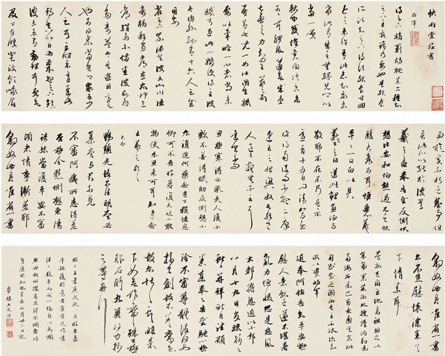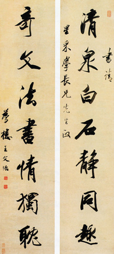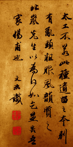 王文治(1730-1802),江苏丹徙(今镇江)人。清代书家。字禹卿,号梦楼。乾隆进士,殿试第三人。官翰林院侍读。出99 宰云南临安府。罢归。工书法,能得董其昌神髓,与梁同书齐名。文治平日喜用淡墨,以表现潇疏秀逸之神韵,时称“淡墨探花”,“谈墨翰林”。善画墨梅,韵致卓绝。诗宗唐、宋,自成一家。并精音律之学。著有《梦楼诗集》、《论书绝句三十首》等。传世书迹较多。《唐玄宗书鹡鸰颂卷跋》,书于癸丑(1793)。纸本墨迹。行书。跋文二则。凡12行,共132字。竖24.8厘米。台北故宫博物院藏。《石渠宝笈三编》著录。王文治的书法,秀润淡雅,法度谨严,给人清新明快的感觉。在清代书坛上有一定的影响。丁文隽在《书法精论》一书中认为王文治与当时的姚鼐、梁、梁同书等面目相近,“均以秀逸见长”,用这一评语来看待王文治的这幅行书题跋是颇恰合的。这幅作品给予人们的绝不是浓重,而是淡逸;绝不是魅力,而是风神。在字里行间,可以窥见王羲之与赵孟頫,却很难见到颜真卿与苏东坡。从此跋字的形态上看,能一任平和自然,不故作惊人之姿,看似寻常,而要达到此境,又并非容易,却不失为此跋的可贵之处。