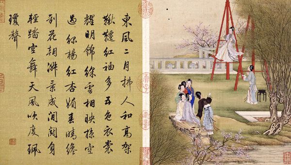 陈枚,清代。字载东,号殿抡,晚号枝窝头陀,娄县(今上海市松江)人。画初学宋人,折衷于唐寅,参以西洋法,能于寸纸尺缣,图群山万壑,以显微镜照之,峰峦林木,屋宇桥梁,往来人物,色色俱备,其用笔之妙,与巨幅同。雍正四年(1726)以供奉内廷劳,赏内务府掌义司员外郎衔。乾隆元年(1736)与孙祜等同绘清明上河图,乾隆七年(1742)尝作鸦飞马健图。
