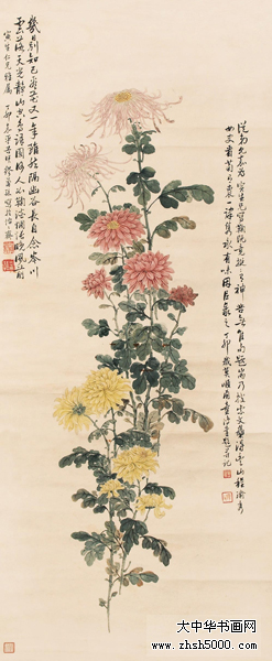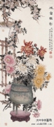 缪谷瑛 (1875~1954),字莆孙,号由里山人、晚香室主。江苏江阴人。为黄山寿再传弟子。工画花卉,最擅写菊。寄居上海,曾任教于仓圣明智大学,为国画教师。时哈同爱俪园中名菊甚众,其课余必往写生。工笔彩绘,极得秋色晚香之盛。经历年积累,笔下所绘之菊达三百余种,时人称之为“画菊专家”。工诗,有《晚香室诗钞》稿。1925年与吴昌硕、王震、张大千、刘海粟等活动于海上书画联合会,1934年又参与婆罗画社活动。其传世作品有1930年作《香清三径图》轴(图录于《现代书画集》)。1950年作《晚香图》长卷,其中名菊有三十二种之多,历时十余寒暑始成。1924年中华书局出版《由里山人菊谱》两册。1936年由于战乱续集画稿不幸遗失,未能出版。1947年《中国美术年鉴》载有《晚香室同门录》。